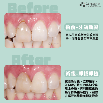 拔除斷牙後,立即植牙並同時補骨粉,再以原斷牙作為臨時假牙,以維持美觀與發音。