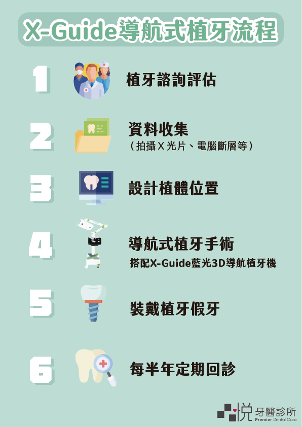 品悅牙醫的導航式植牙以搭配美國新科技X-Guide醫療級超級電腦,讓人工植牙前可用於術前診斷和治療計畫,以及手術中利用光學追蹤,像GPS導航,導引器械和人工植牙方向。搭配導航植牙機可以在一日內達成掃描、計畫、導航,讓人工植牙可以更精準、安全、舒適的效果。