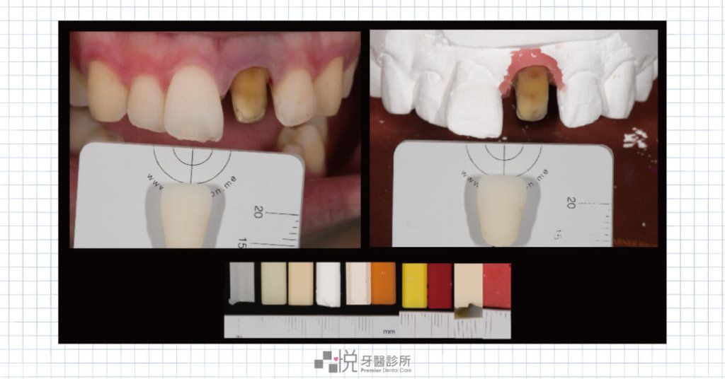 為了模擬假牙底下的真牙變黑透出來所造成的影響,比色驗證時,還要另外費工製作一個模擬口內顏色的模型。真的是非常「搞剛」,這樣製作出來的假牙,才能逼真再逼真喔。