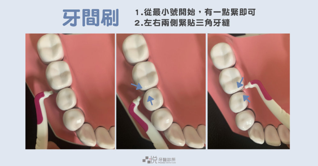 隨著年紀的增加、骨頭的流失,牙縫會越來越大,特別是牙周病病人,牙間刷就是時候出場了。牙間刷會增加清潔的效率,從最小號最細的牙間刷開始試,大小上的選擇以清潔時有一點點緊為佳,不傷害牙肉為原則