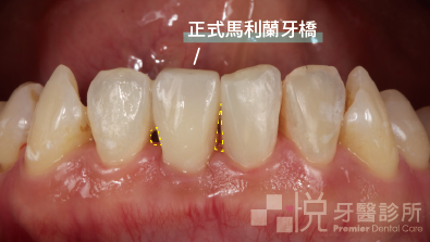 另外順帶一提,因為馬利蘭牙橋「必須」黏著在鄰近牙齒表面的牙釉質,所以如果兩側的牙齒是假牙冠的話,那也是不適合製作的喔。