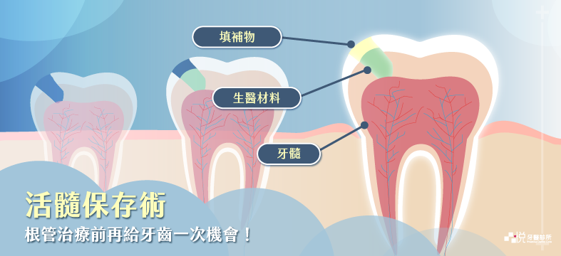 活髓保存術是牙齒因深度蛀牙、外傷等原因,導致內部牙髓組織快暴露與已暴露在外界時所做的治療,藉由良好的生醫材料,創造出保護神經的屏障,讓牙髓神經恢復健康,刺激牙本質的生成。