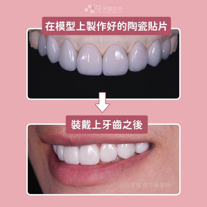 陶瓷貼片在模型上與裝戴在牙齒之後