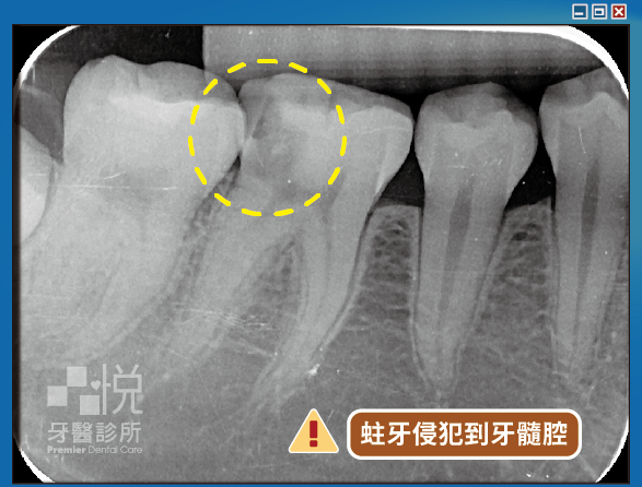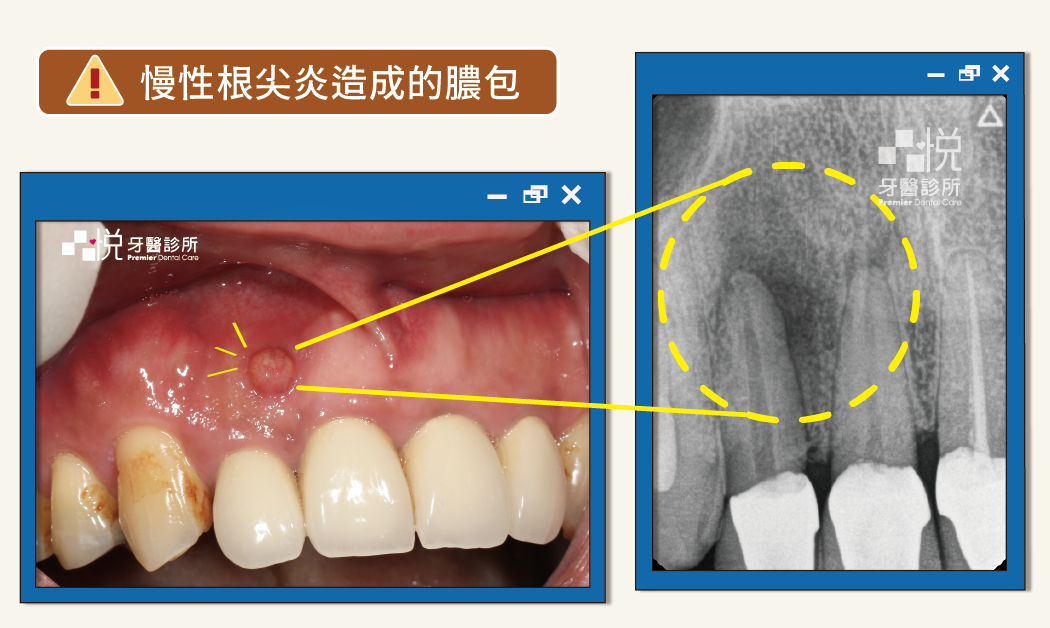 當蛀牙細菌感染神經腔與神經管後,一開始會因為牙髓炎而感到劇痛,但隨著神經壞死就不痛了。細菌會持續滋生擴散至牙根尖造成牙根尖感染,就會在根尖牙齦反覆產生膿包。