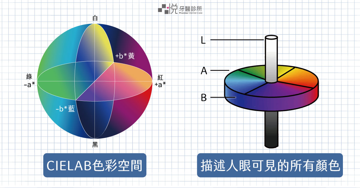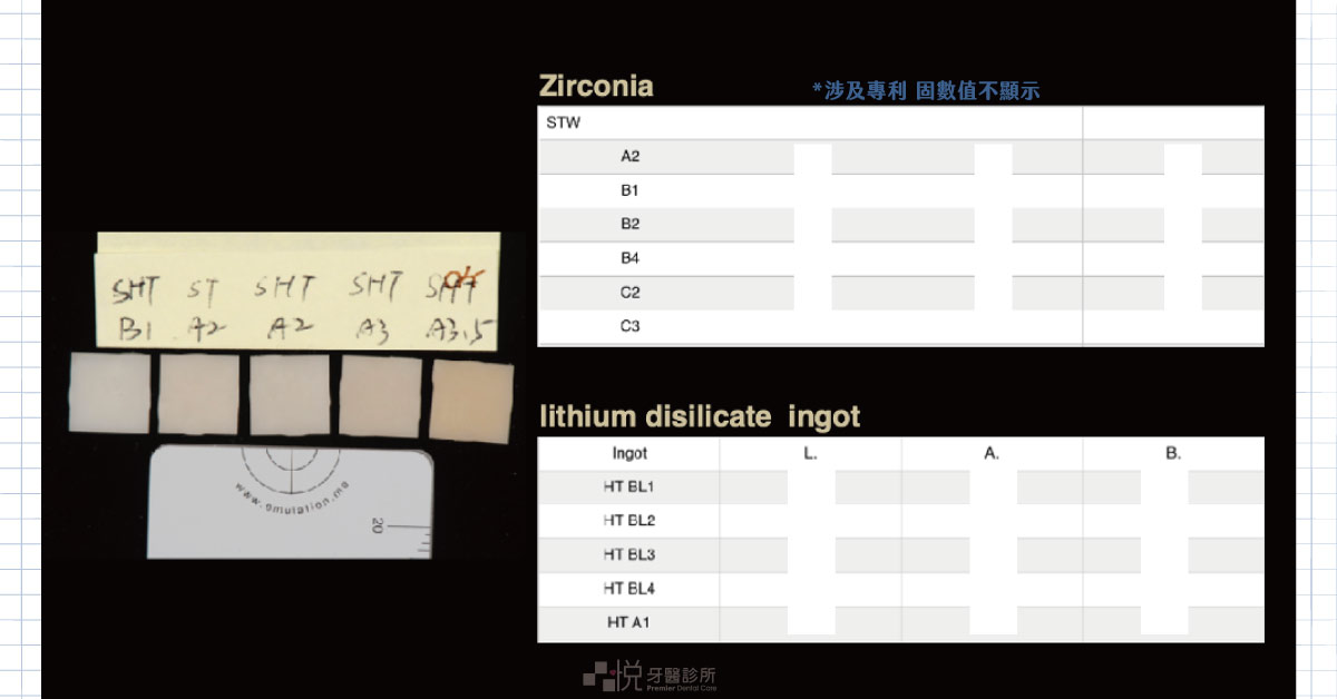 目前牙科較常使用的顏色系統是「CIELAB色彩空間」,絕大部分顏色都可以找到自己的顏色編碼。而技師手邊也有建立龐大的瓷粉、瓷塊的顏色資料庫。運用這些數字,選取相對應的陶瓷來製作、調色,這種方法叫做「e化比色」,是一種非常科學、精準的比色方式,也是目前饒醫師採用的方法。