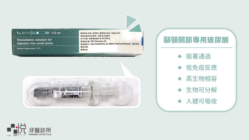 顳顎關節專用玻尿酸:衛署通過、低免疫反應、高生物相容、生物可分解、人體可吸收