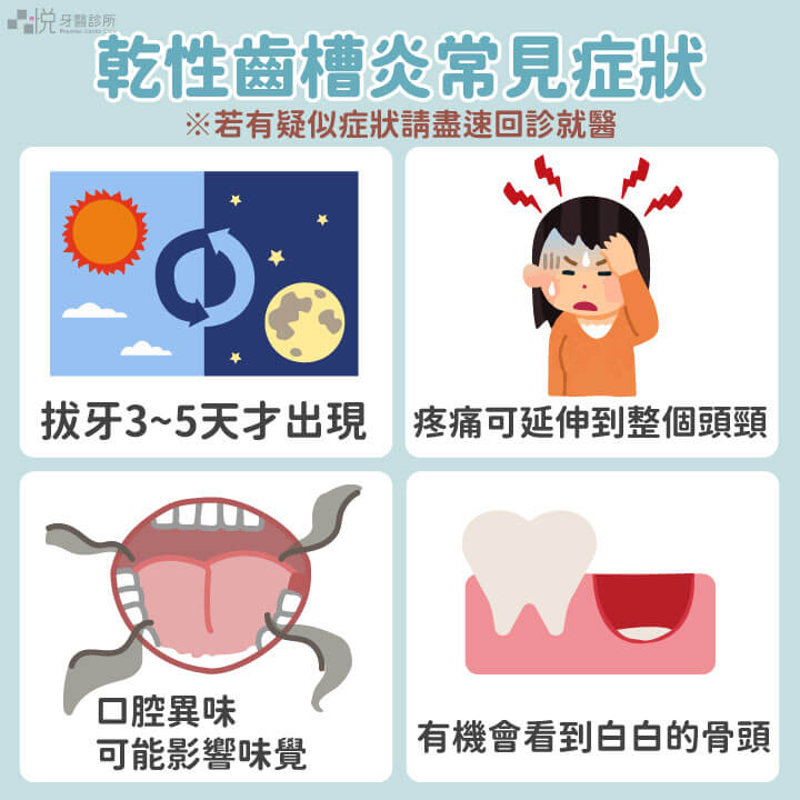 乾性齒槽炎並不是炎症,而是因為傷口沒有血塊的保護,讓神經暴露造成刺激疼痛。