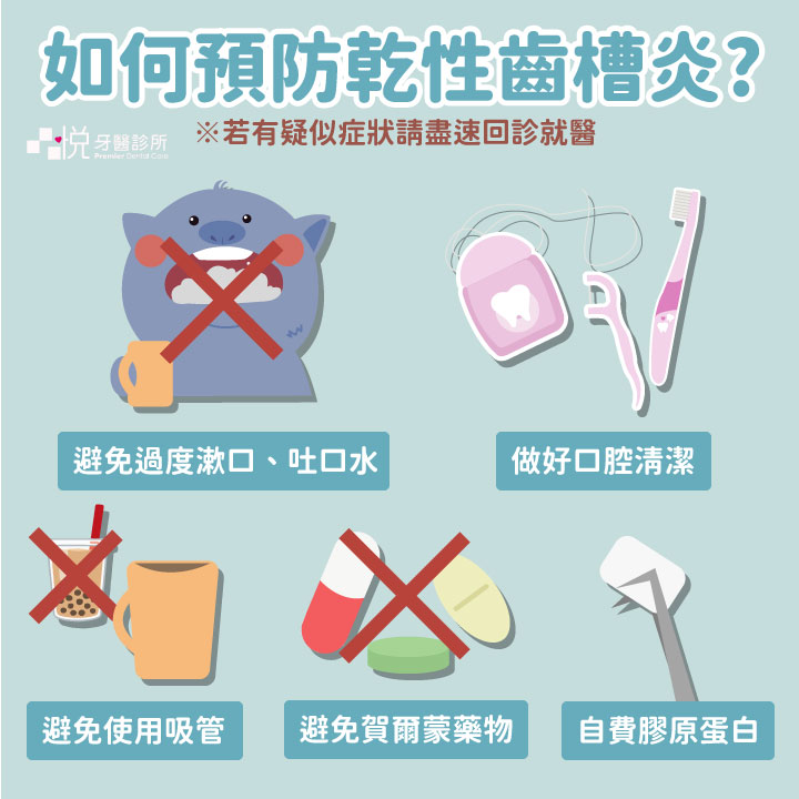 要避免乾性齒槽炎就要避免以上的動作,或是在拔牙時即使用膠原蛋白保護傷口。