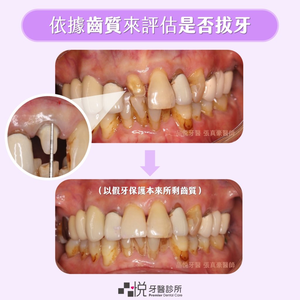 牙齒因嚴重蛀牙或構造缺損嚴重,需要考量到所剩的齒質及牙根長短,經醫師評估,是否能以假牙(牙套)保護,或者只能拔牙。