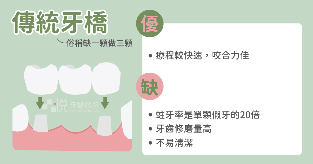 傳統牙橋的療程較快速,且咬合力道與真牙差距不大。治療方式已經歷史悠久,有許多相關的研究,而且不需手術。