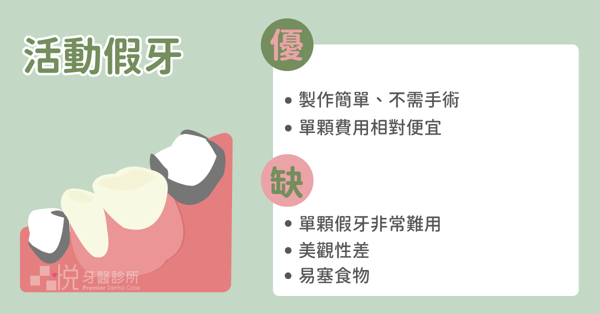 單顆活動假牙非常難用、不好咬、非常易塞食物、美觀性差⋯⋯令人抓狂。如果用久了鬆掉,有時還會把假牙噴出去,超級尷尬。總之缺點很多,單顆或少量缺牙時,建議還是以其他治療為主。不過多顆缺牙時,雖然活動假牙仍有以上缺點,但考量多顆植牙、假牙的預算會暴增,大範圍手術對身體的負擔更大,活動假牙倒是不失為一種可考慮的治療方式。