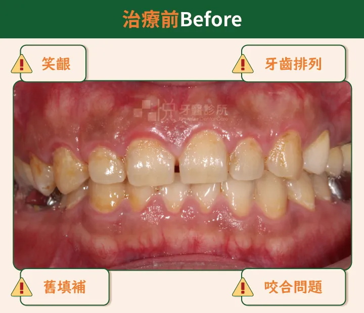 | 牙齒排列不正 | 例如暴牙,牙齒過度前突,微笑時嘴唇遮不住牙齦。 |