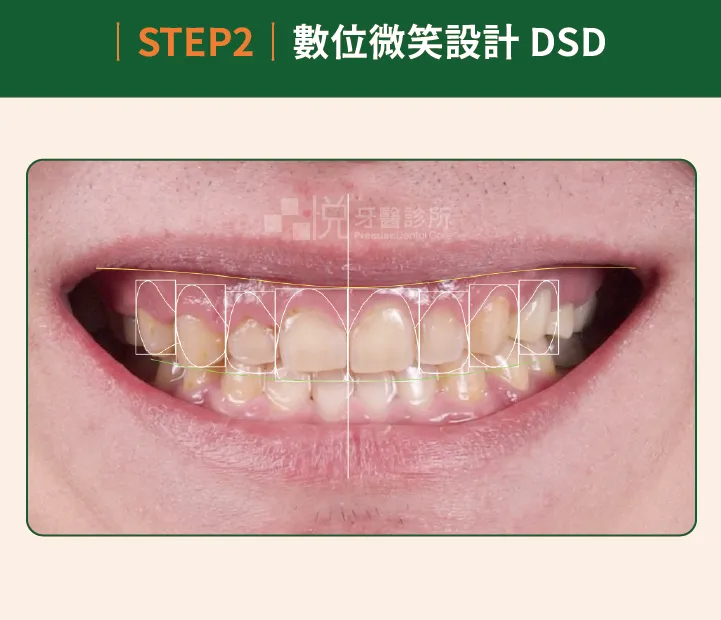 正如前面文章所提到的,完整謹慎的術前評估和分析是治療成功的關鍵,所以我先針對口內的狀況做了一個全面檢查,然後再根據臉部及笑容去做分析和數位微笑設計(Digital smile design , DSD)