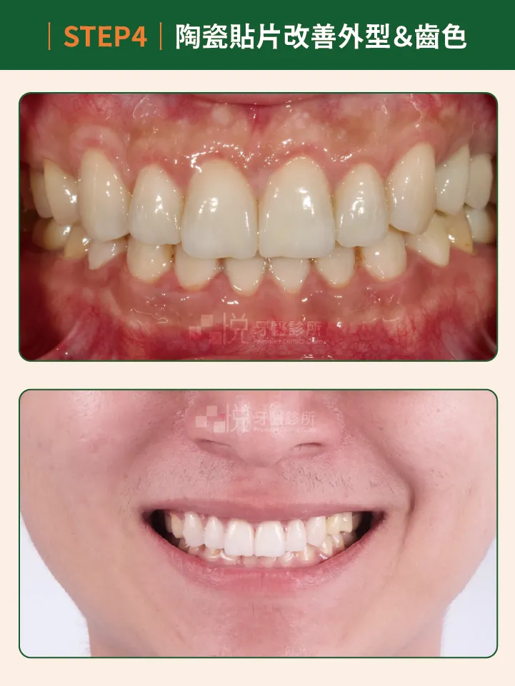 在我阿弟的案例中可以看到,經過牙冠增長術之後,笑齦和牙齦左右不對稱的問題獲得了大幅度的改善,再搭配上陶瓷貼片去改善牙齒的外型和顏色,讓整體笑容加分到爆表啦 ~~