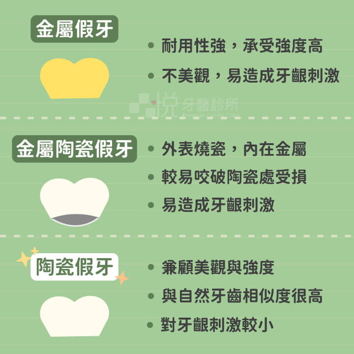 - 金屬假牙: 金屬合金通常是使用鉻鈦合金或貴金屬製成。金屬合金的優點包括耐用性強、強度高,可以承受咀嚼壓力。可以在咬合空間不足,牙齒很短的情況下使用。然而,金屬假牙仍不如全瓷冠自然美觀,金屬假牙當中的某些成分(鎳,鉻)可能對牙齦造成過敏刺激。