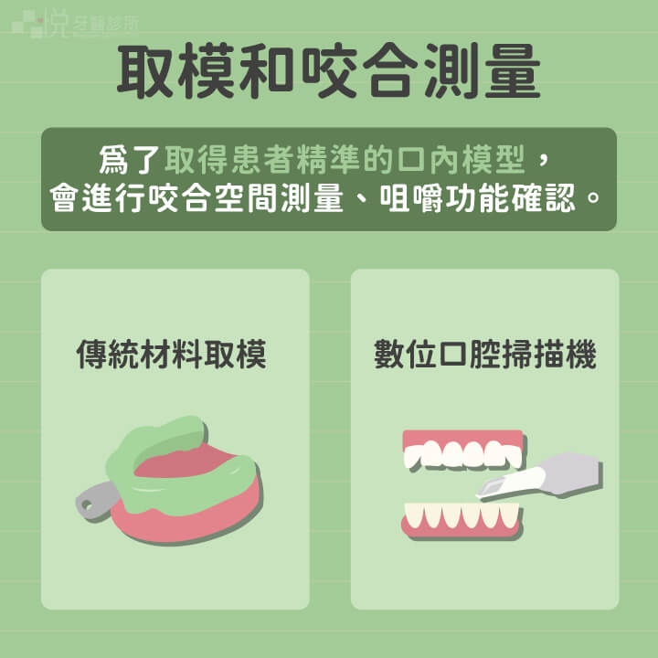 - 取模和咬合測量*:(如下圖)目前使用兩種方式取的口內模型,口腔掃描機擷取,或是傳統材料取模,得到口腔的精準模型,製作合適的假牙牙套。同時,還會進行咬合空間測量,咀嚼功能確認。