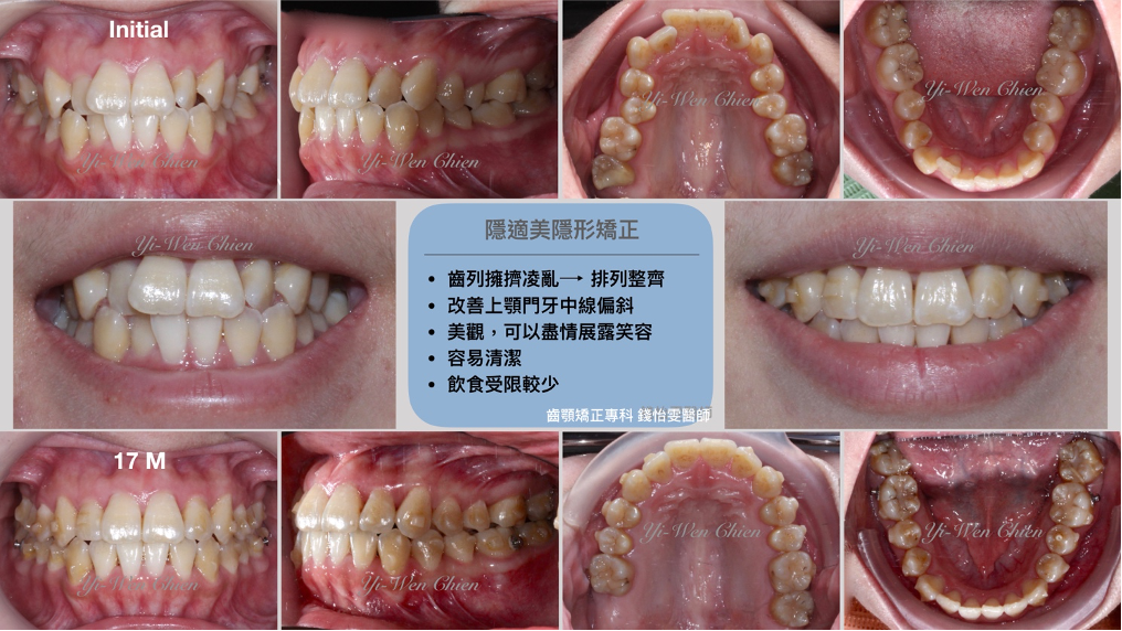 除此之外,許多年紀較小的孩童或青少年,大多是家長想要孩子進行矯正治療,而非患者本身的意願。由於隱適美隱形矯正的治療效果需仰賴病人的高度配合,若患者對於矯正治療的動機不高,配戴時間往往會不盡理想,矯正效果當然也就不如預期。建議可以改成配戴傳統矯正器進行治療,或是等患者本身有強烈的治療動機後再開始矯正治療。所以對於自律性不足的患者,高自由度的隱適美矯正方案可能就不是最適合的選擇。
