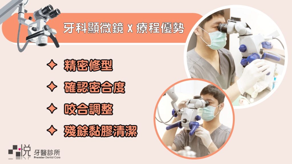 多餘的黏膠會造成細菌堆積,會造成牙齦持續發炎,也很容易造成染色等美觀問題,使用顯微鏡可以精密的操作黏著流程,去除多餘的殘膠,得到理想的修復成果。