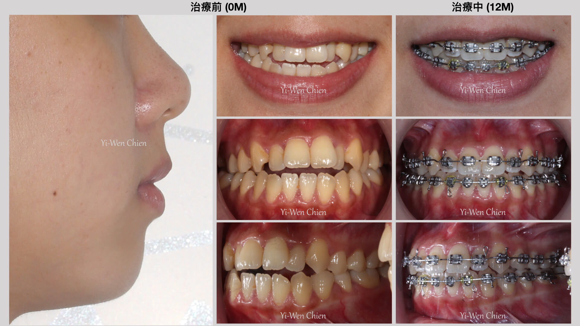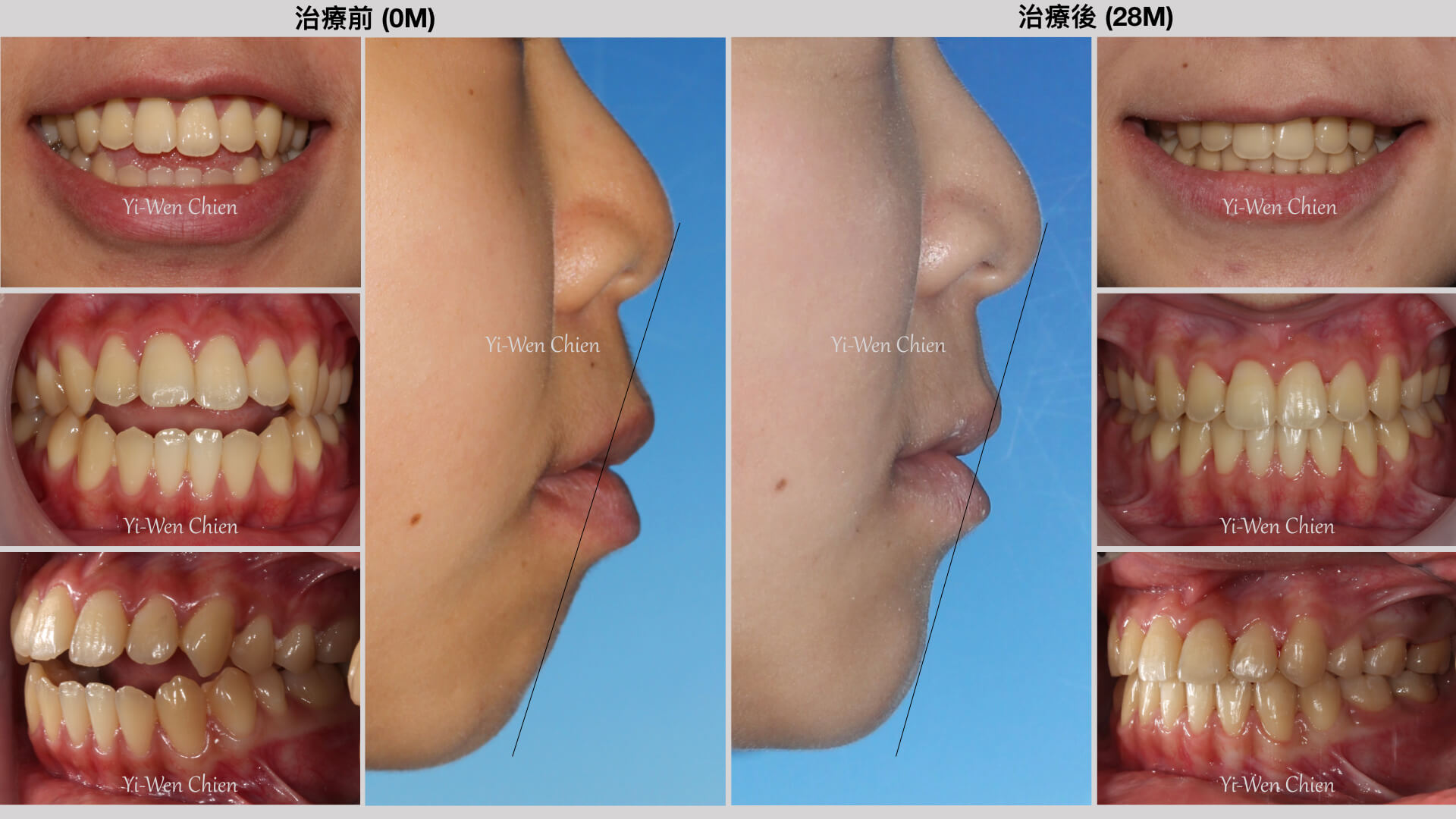矯正治療中拔除四顆小臼齒,並且使用骨釘壓入上顎大臼齒,讓下顎得以做逆時針向前向上的旋轉。關閉前牙開咬的同時,也改善了長臉型以及下顎後縮。