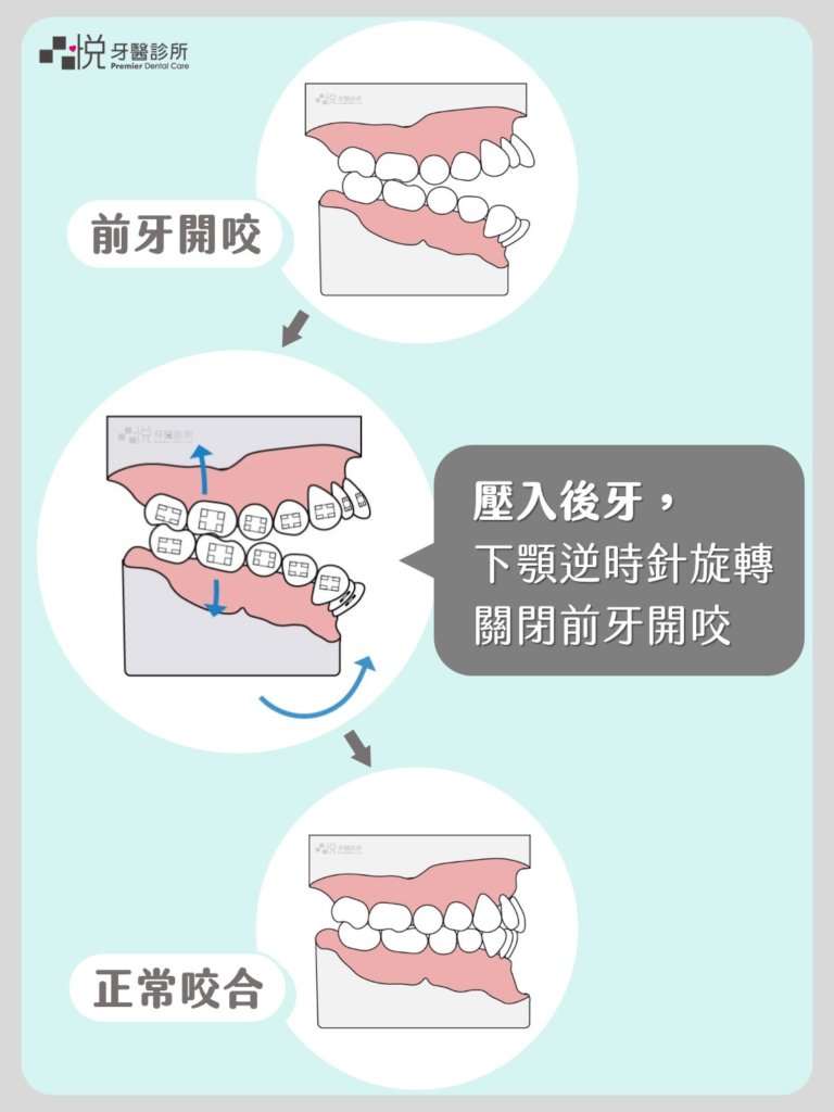 第一種常見的前牙開咬治療方式是壓入後牙,下顎逆時針旋轉關閉前牙開咬