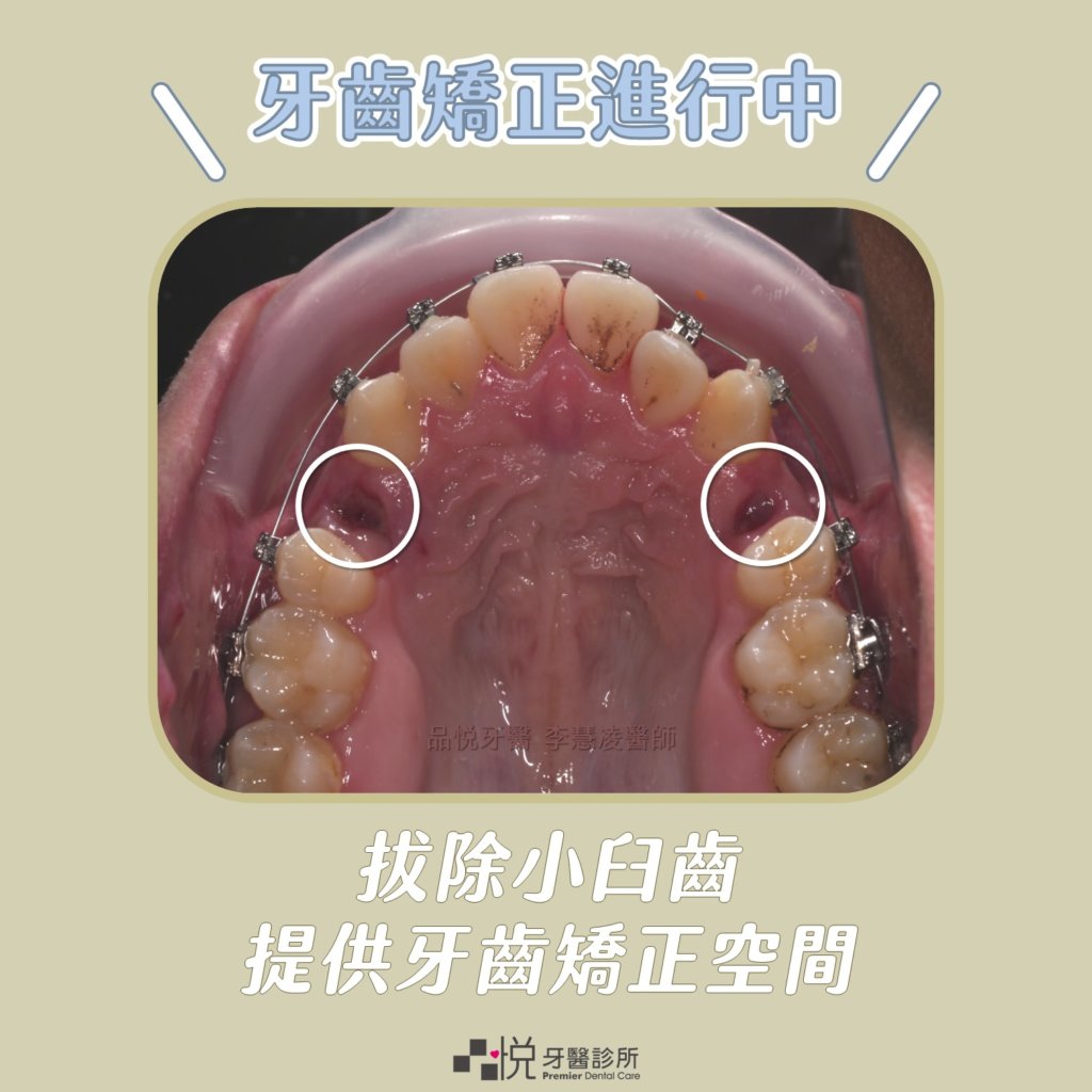 以上圖案例為例,是拔除兩側第一小臼齒(中線數來第四顆),可以讓前面六顆牙往後退(右側犬齒到左側犬齒),同時解決齒列擁擠和暴牙的問題。