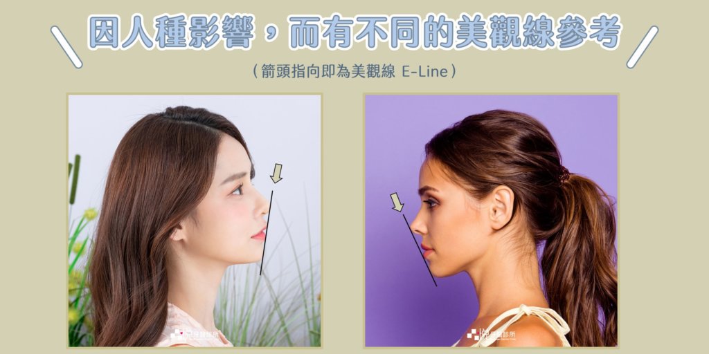 當然美是一件主觀的事情,而美觀線的參考也會受到人種的影響,像白種人的鼻子和下巴比較挺, 其上下唇會在 美觀線E-Line 內側許多。