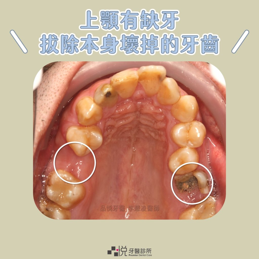 除了前段提及矯正拔牙常見拔除小臼齒外,會同時合併考量本身口內的狀況,可能會拔除原本已經壞掉無法保留的牙齒,詳細案例可參考如下: