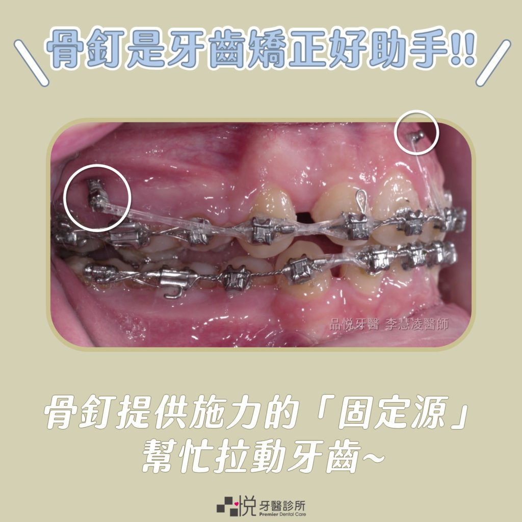 骨釘的功能是提供施力的固定源,幫忙拉動牙齒,通常骨釘植入點像是上下顎後牙區,牙齒槽間隔等。