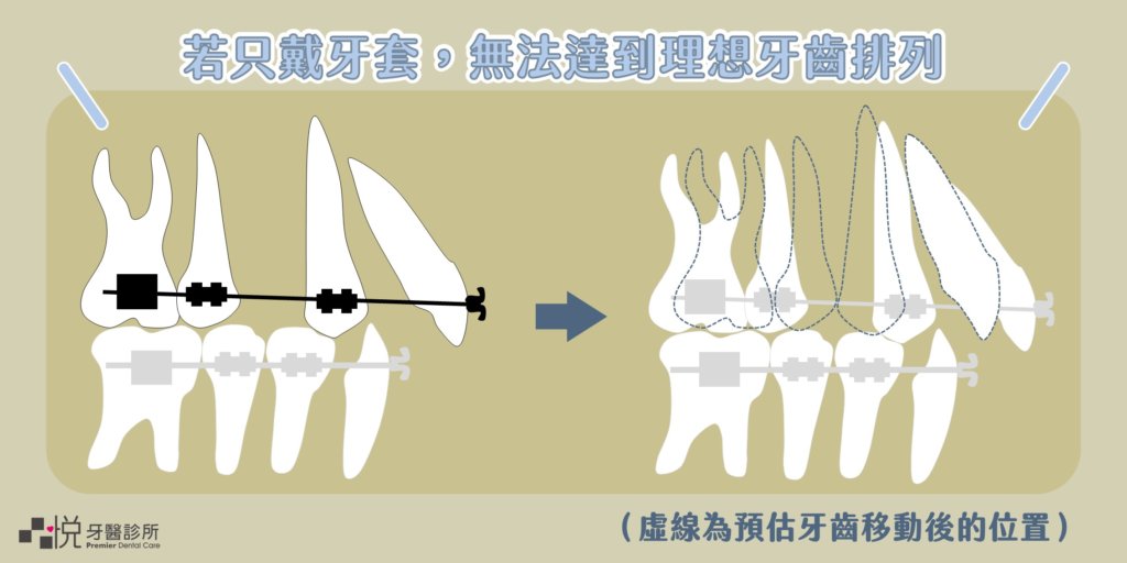 單獨拔除小臼齒,關閉拔除空間時,後方的牙齒也會同時往前,若只戴牙套,無法達到理想牙齒排列。