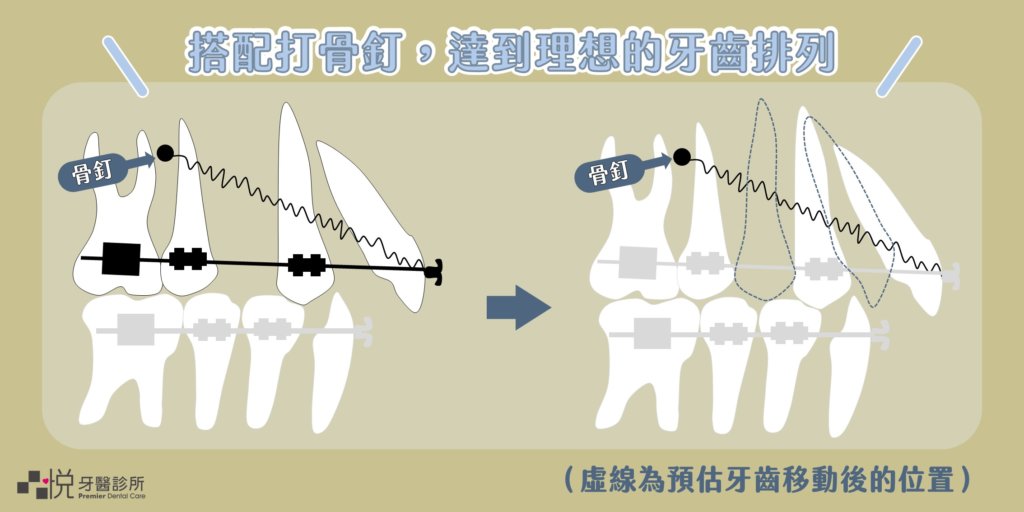 若暴牙的狀況較嚴重,這時候就需要骨釘的幫忙了,因拔除的小臼齒空間,希望完全將前面的六顆牙齒往後拉。
