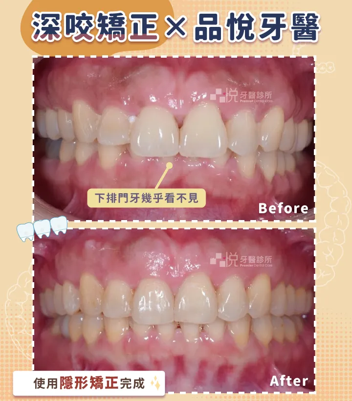 當上排前牙覆蓋下排牙齒超過二分之一甚至更多,讓下排門牙幾乎看不到,這種情況即可被定義為「深咬」。