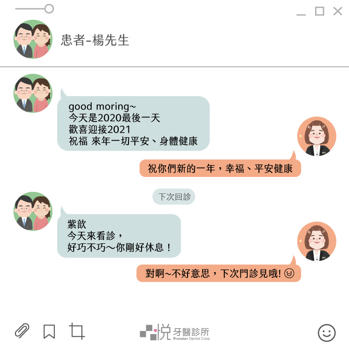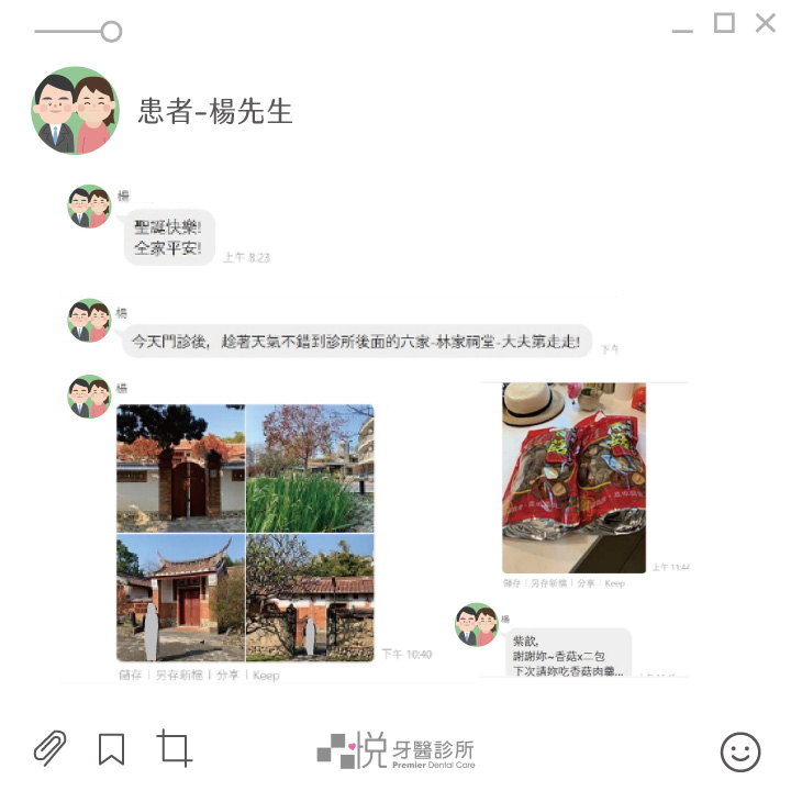 除了她自己的療程願意交付給我們,她的先生也意外成為我在品悅牙醫負責的首位一日全口重建患者。至今,我們的關係居然也從客戶,變成是家人!過年過節的關心當然少不了,兩夫妻每次回診,也都會聊上幾句,也主動關心我的近況,這種關係轉換真的很特別。
