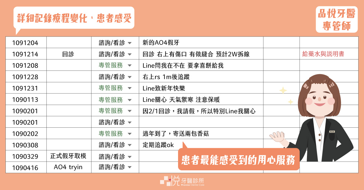 最後確定並同意療程計畫內容後,療程開始我們就要做報表的追蹤,從療程、費用、與病人每次的對話都要做紀錄,直到療程結束。這真的是專管師花最多心思及時間經營,也是病人最能感受到被用心服務的部分喔。曾經還有病人因為對於我們專管師的信任,所以變成朋友的關係。