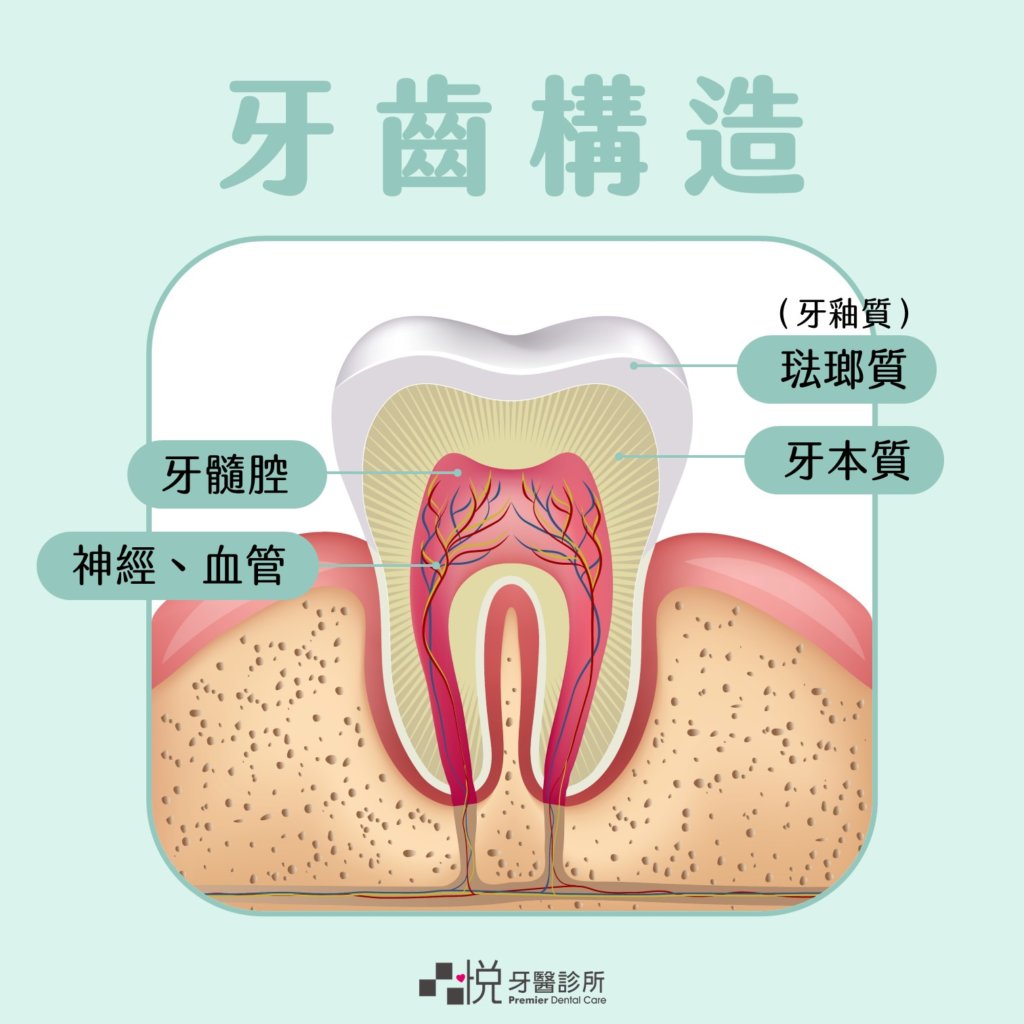 牙齒內部構造:琺瑯質(牙釉質)、牙本質、牙髓腔、神經、血管