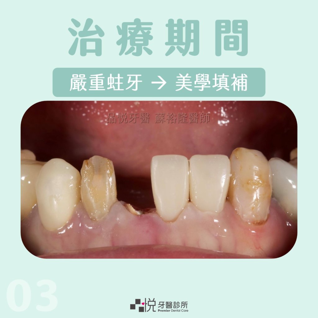 治療期間:嚴重蛀牙治療,以搭配美學填補恢復重建