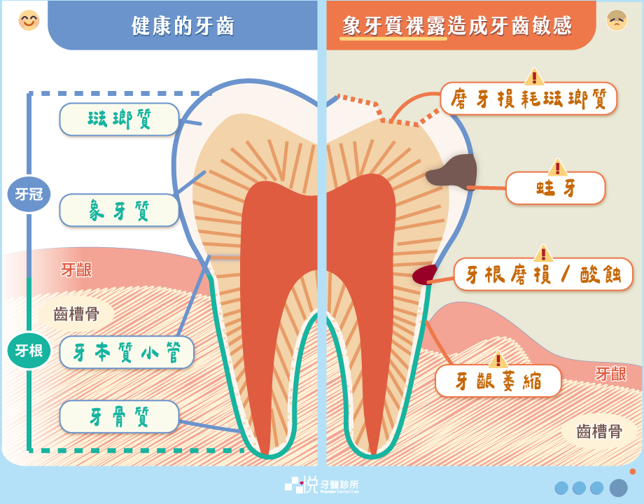 象牙質中有許多牙本質小管,會將外界的冷熱、滲透壓變化、物理刺激傳入牙神經,引起酸痛感。所以當象牙質裸露在外時,就會因為吃冰、吃甜食或是刷牙刺激而感到酸痛。