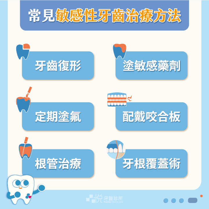 除此之外,一些牙科治療後也會有暫時性的牙齒敏感症狀,如:補牙、美白療程、牙周治療、製作齒雕或假牙⋯⋯等。當出現牙齒敏感症狀時,無需太過擔心,可先與醫師討論確認狀況,再做處理。