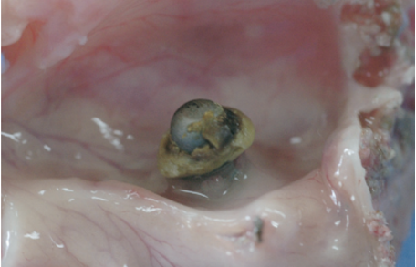 上圖為植體穿進鼻竇膜且術後半年後呈現的樣子,可見植體表面有很多汙垢。此處位於鼻竇內襯的鼻竇膜。