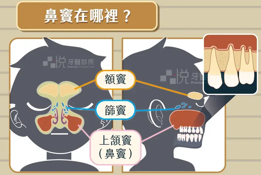 因鼻竇的構造與上顎的牙根很靠近,當牙齒的牙根發炎很嚴重時也會引起鼻竇的發炎喔! 因此牙科很多治療(如拔牙植牙根管治療)需要考慮到鼻竇的影響。