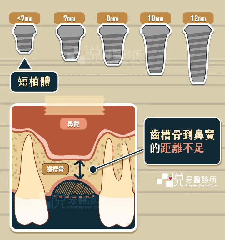 植體有很多種長度,治療過程醫師會依病人條件下選擇最合適的長度,一般來講短於 7mm 的植體我們稱之為「短植體」。