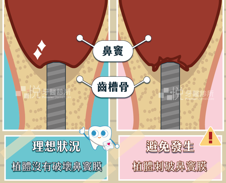 治療如果忽略剩餘骨高度,直接把植體貫穿鼻竇的空間時,我們身體可能會把植體視為外來物,會有引發鼻竇發炎的風險