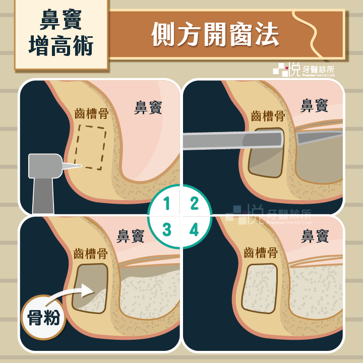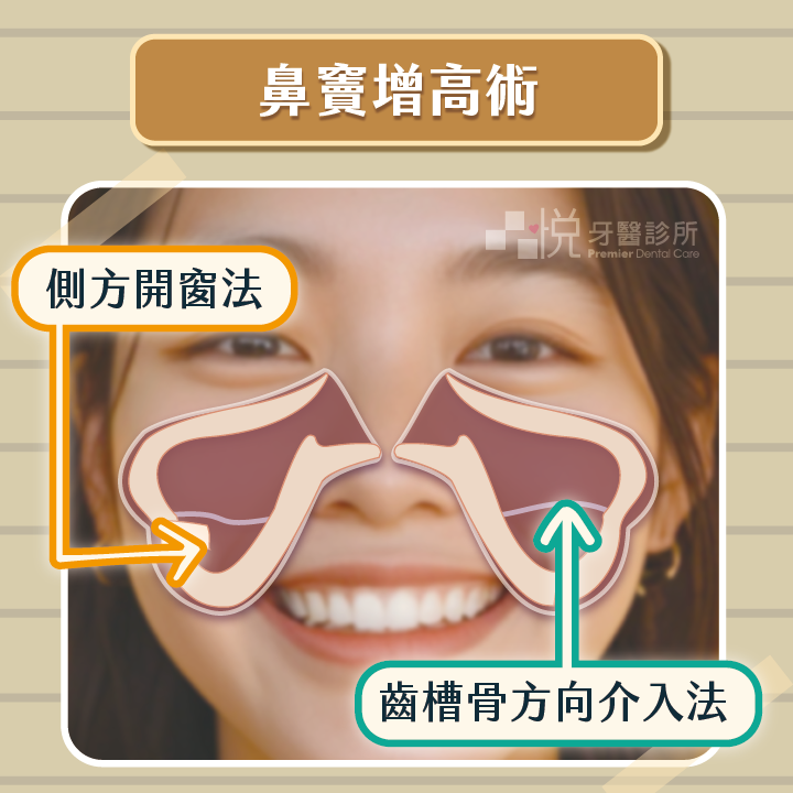 鼻竇增高術有兩種術式:「齒槽骨方向介入法」與「側方開窗法」