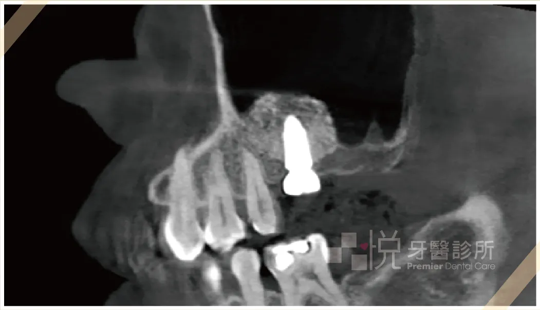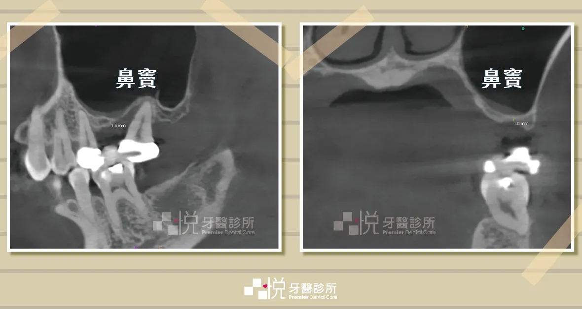治療中希望齒槽骨到鼻竇距離足夠長,避免植體刺破鼻竇膜引發發炎、感染風險。