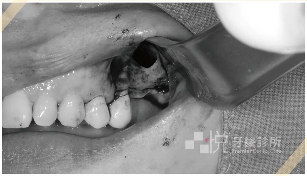 ➊由於剩餘骨頭高度剩約 1mm 嚴重不足,醫師決定先進行鼻竇增高術,半年後再植入植體。