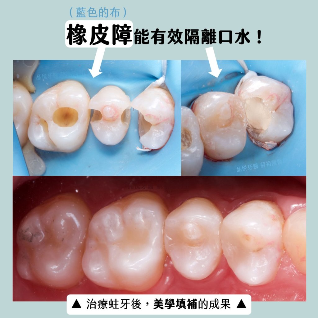 橡皮障有效隔離口水,治療蛀牙後達到良好的美學樹脂成果