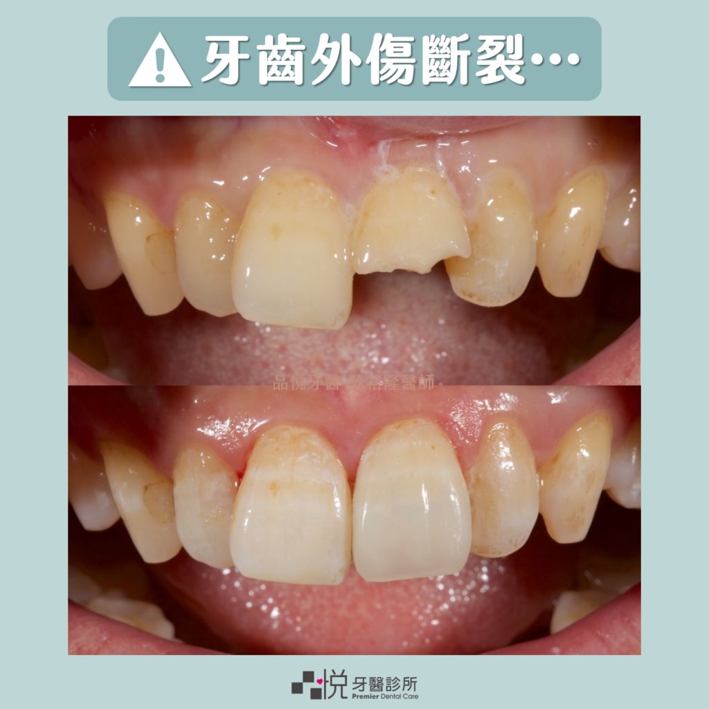 牙齒因外傷斷裂的時候,樹脂修復可以快速的恢復牙齒型態,重建基本的美觀和發⾳咀嚼功能。這類案例因為牙髓活性需要追蹤一段時間,所以樹脂有時候會當作暫時性的修復物而已。