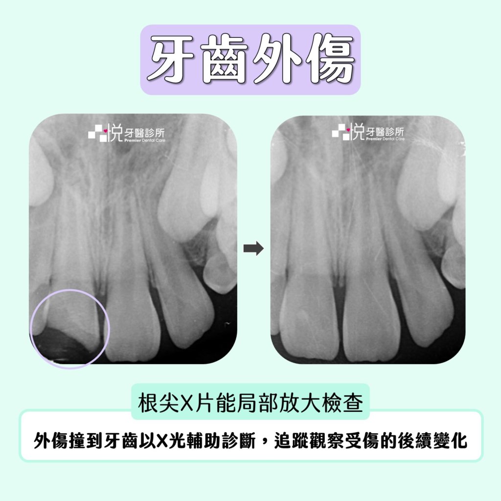 若是因外傷撞到牙齒,會需要拍攝X光片輔助診斷,來決定後續的治療,也常需要作追蹤檢查來觀察受傷後的後續變化。