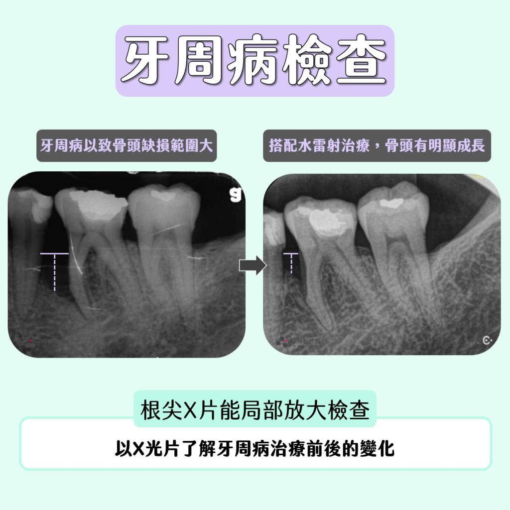 在拍攝局部X光片中看見根尖發炎,能清楚了解根尖發炎程度,並且在根管治療(俗稱抽神經)後,以X光追蹤根尖復原情況。
