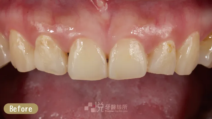 這位患者來找我時,門牙上留著不少看起來有許多故事的舊樹脂。那些多年前填補的材料,邊緣已經開始鬧脾氣,不但出現了明顯的黑縫,還染上一層洗不掉的咖啡色,看起來就像牙齒沒刷乾淨,其實那是樹脂老化的求救訊號。