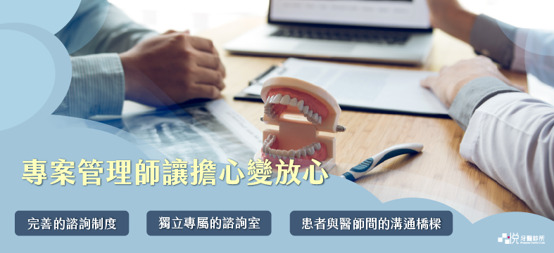 品悅牙醫有完善的諮詢制度、獨立專屬的諮詢室,透過專案管理師(以下將簡稱為專管師)諮詢,您會更有充裕的時間了解治療進度與相關費用。